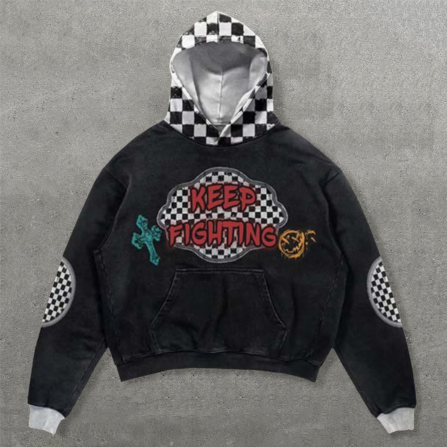 Keep Fighting Faux Decal Print Long Sleeve Hoodies