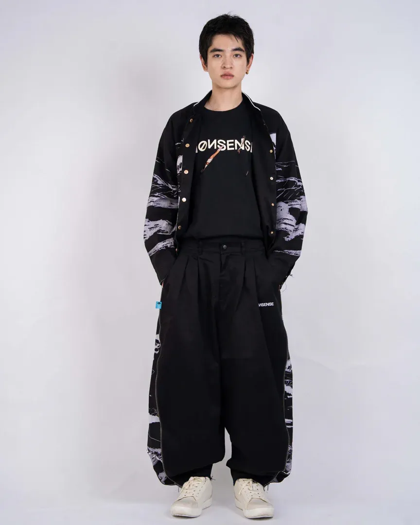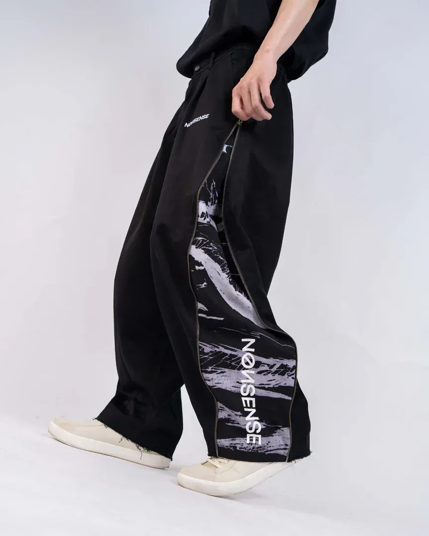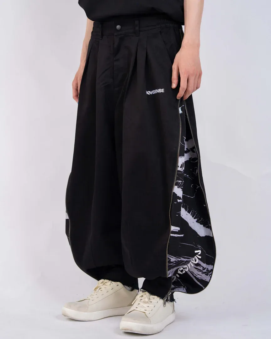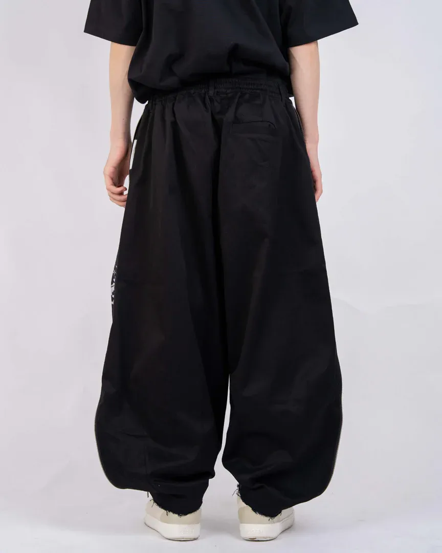 The OKARUN TRANSFORMATION PANTS, crafted in 100% cotton with a loose fit and side zips. Reveal the custom print underneath or keep it clean with the solid black look.