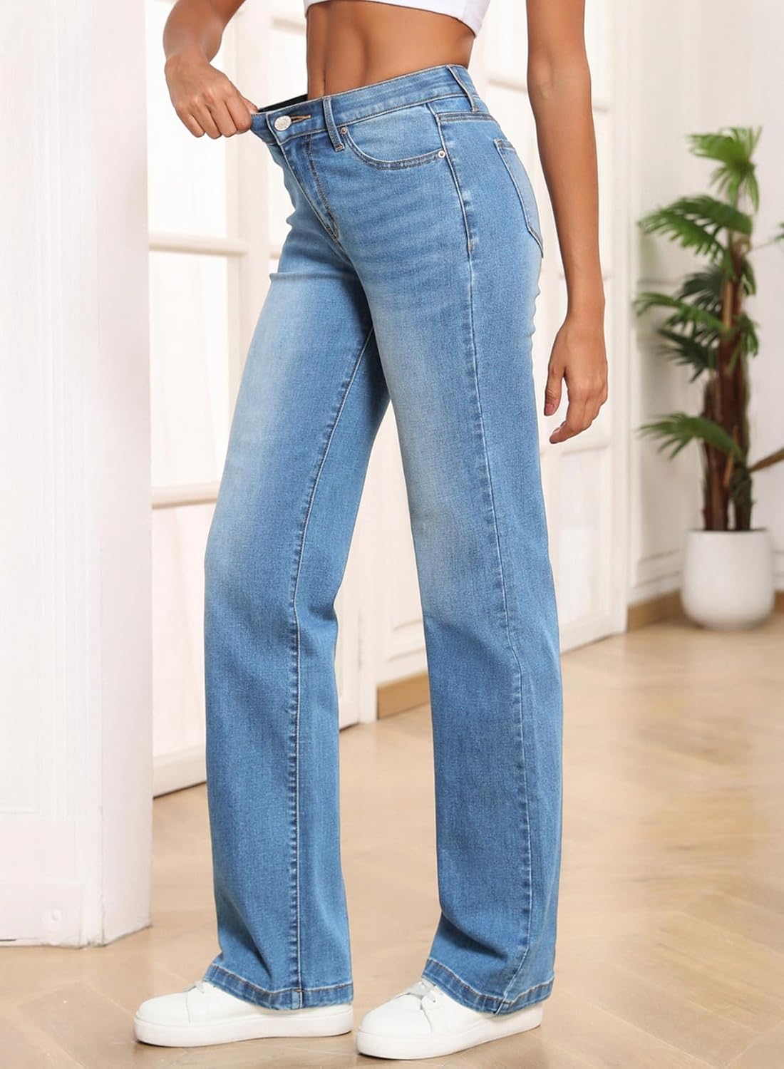 - Feature: Sidefeel jeans for women boast a wide straight leg design, which complements the leg line. The high-waisted design coupled with the elastic waistband highlights your slender waistline, making you even more charming and attractive