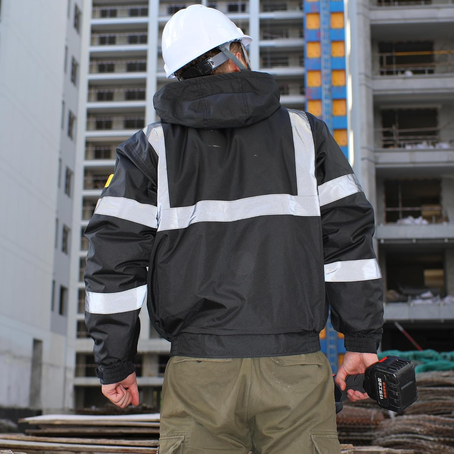 - Multi-Pocket reflective jackets for men:sesafety hi vis bomber jacket men waterproof comes with 1 removable hood, 1 inner chest pocket, 2 lower slant pockets, 2 mic tabs, 1 cell phone pocket, 1 clear ID holder, and 2 pen holder pockets on sleeves