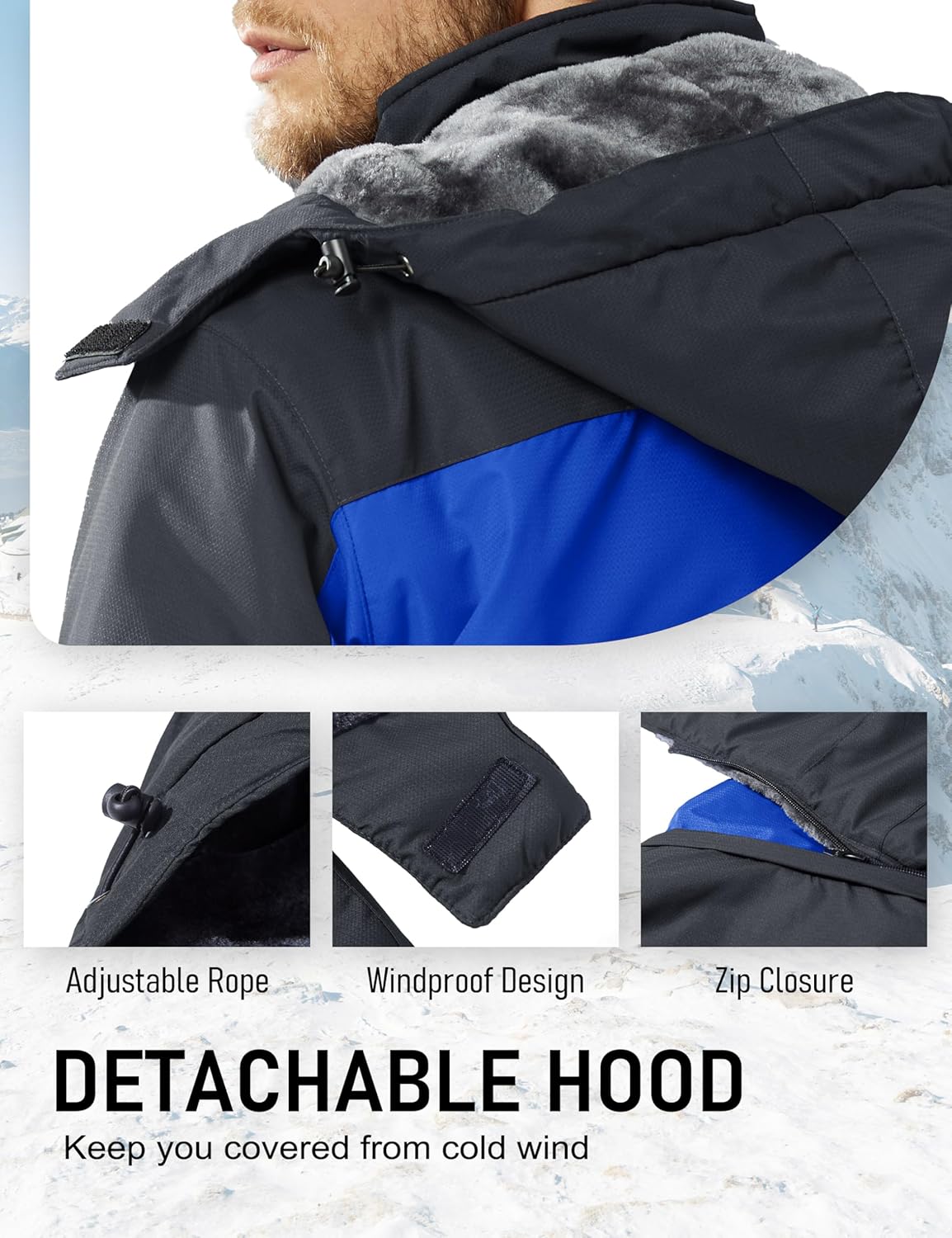 - WINDPROOF: Adjustable cuffs with hooks and loops help seal in warmth; Internal drawcord hem, detachable and adjustable storm hood, full length zip closure, stand collar, all the attentive designs keep out the wind effectively