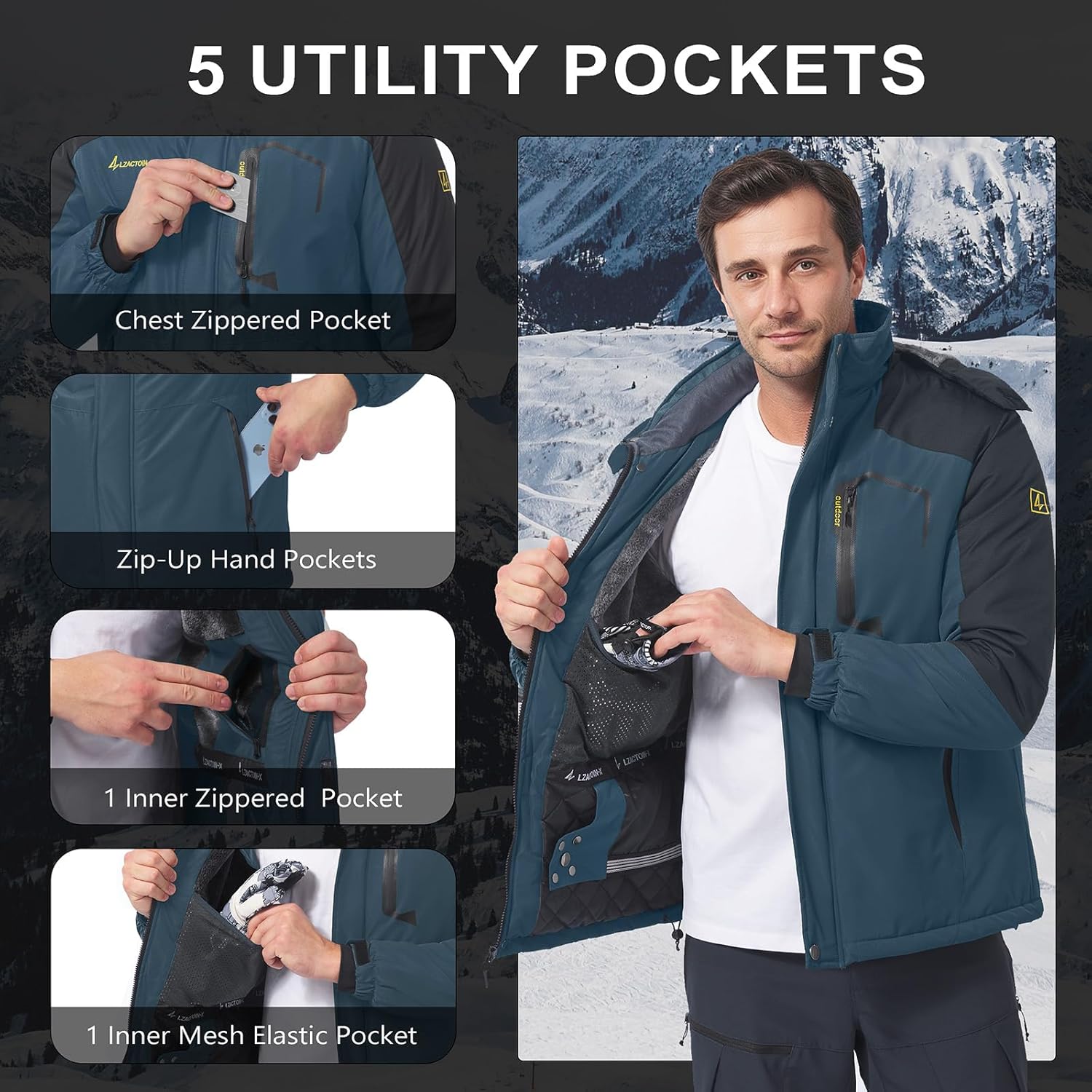 - 【5 BIG WATERPROOF POCKETS】: Men’s skiing jacket has 2 zippered hand pockets, 1 zippered chest pocket, 1 internal big mesh pocket, and 1 internal secure zippered pocket—suitable for storing your phone, wallet, ski gloves and other accessories. All zippered pockets are waterproof to keep items dry.