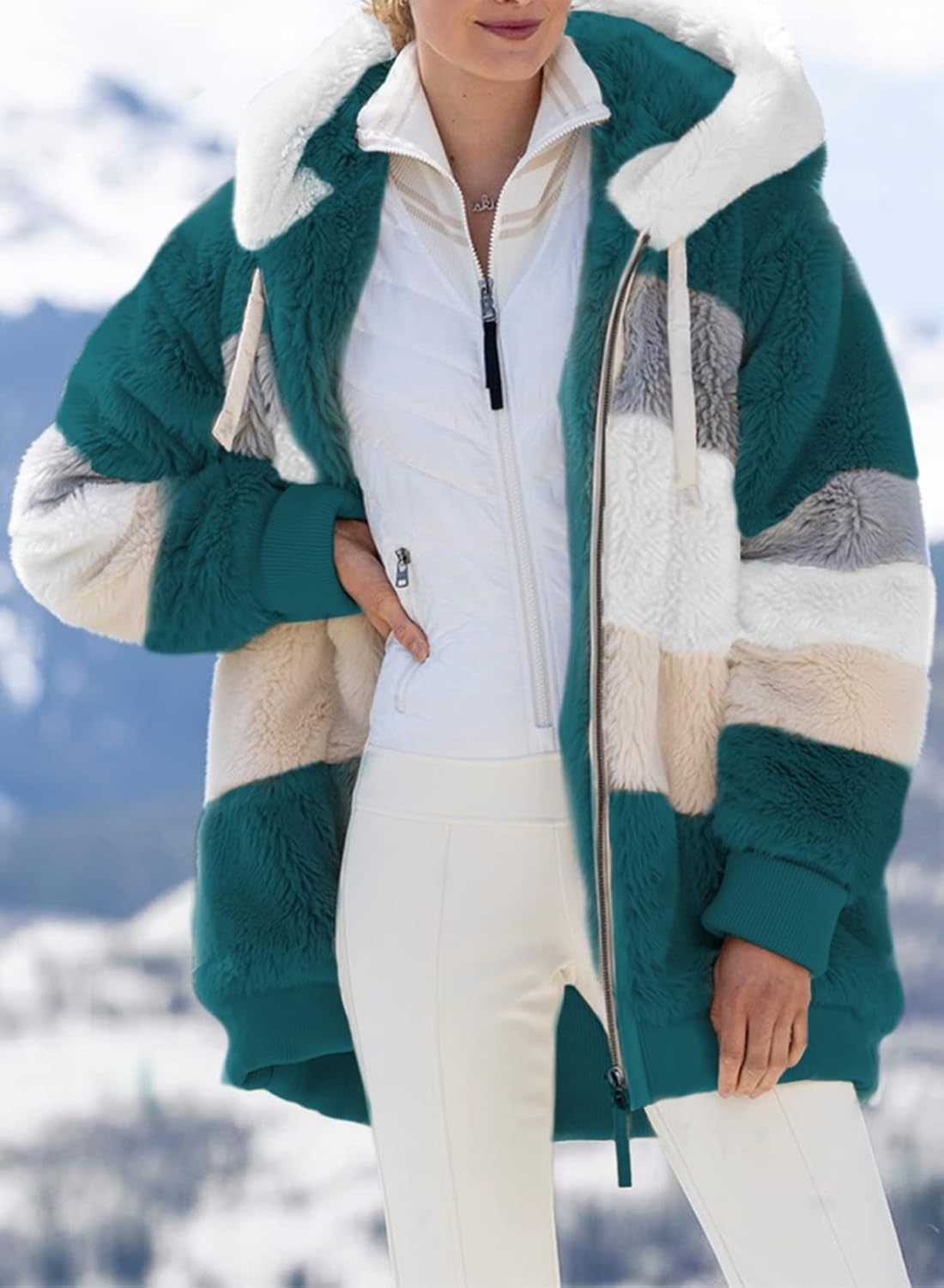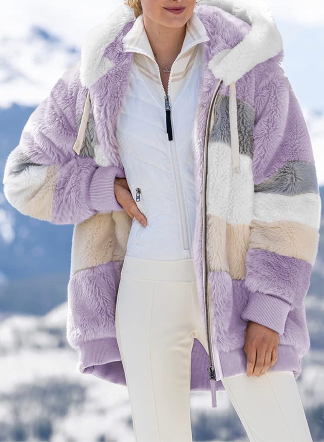 - The women casual jacket coat features hooded,front zipper,soft and comfy fleece material,fashion Color Block Patchwork,two side pockets,oversized style can fit more body for ladies.
