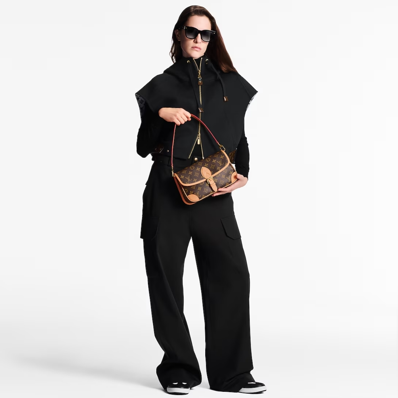 The Diane satchel in Monogram revisits a classic model from the 90s, combining such vintage details as corners and an archival-inspired buckle with the modern functionality of smart pockets and a well-organized interior. The exclusive wide jacquard strap reverses from a bold Louis Vuitton signature to a subtle Monogram Flower motif.